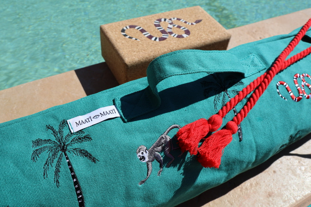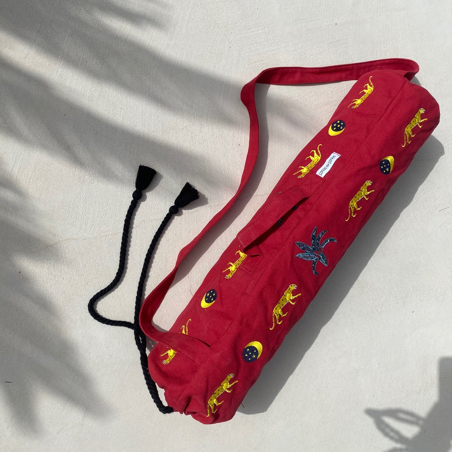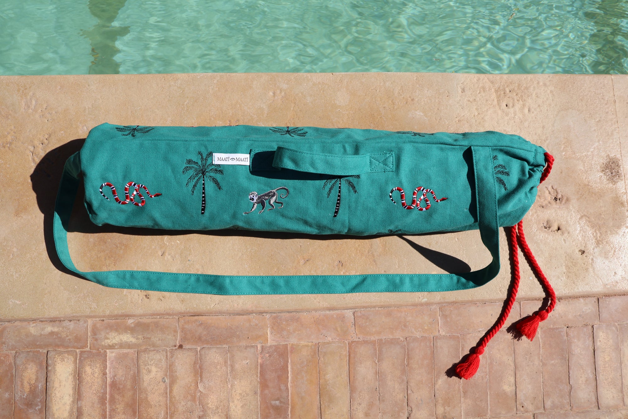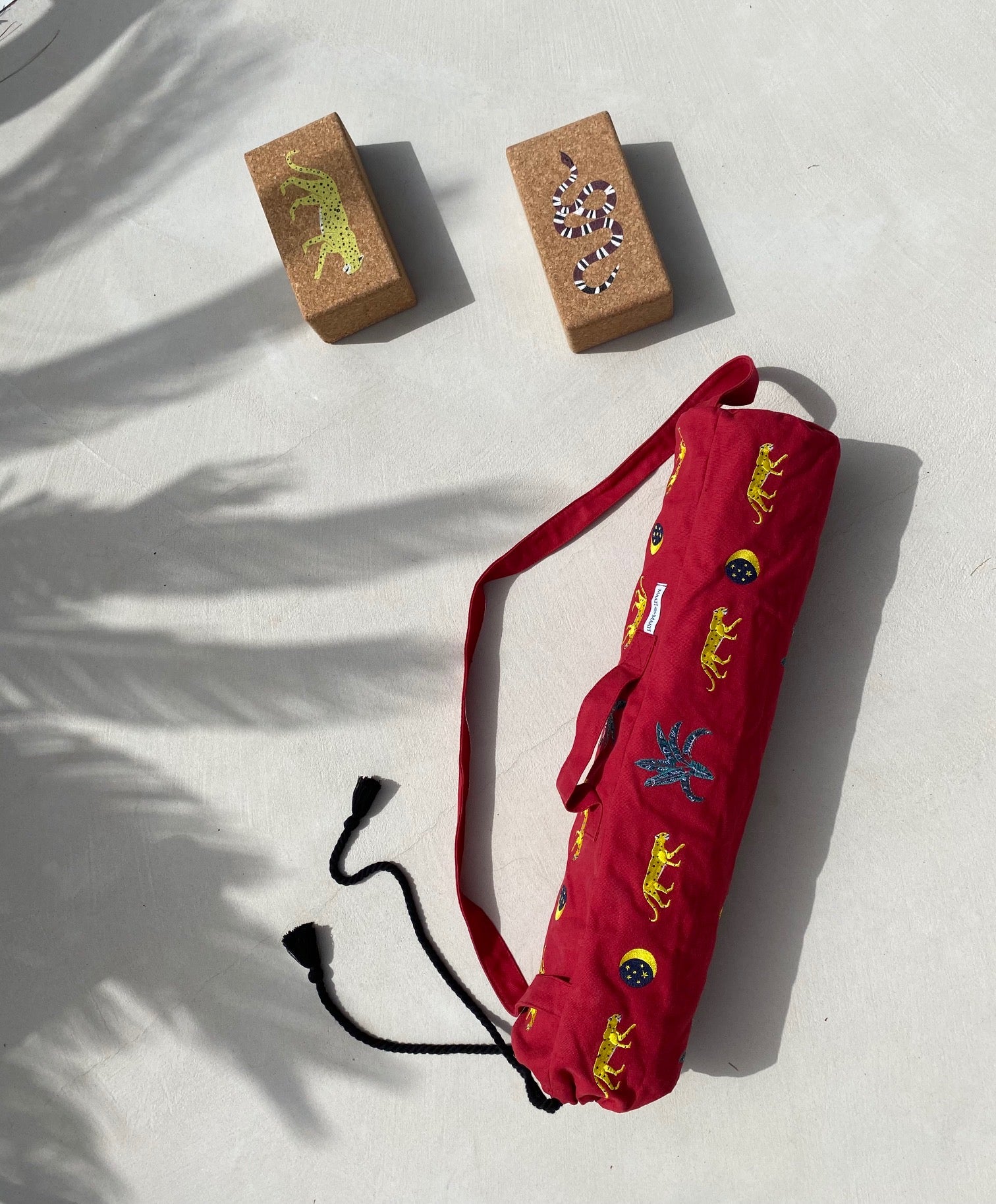The practical yoga bag not only provides protection for your mat, but is also a stylish it-piece. It is made of canvas, a strong, tightly woven yarn and has a macramé cord. The high-quality design is embroidered with different icons, which symbolize the specific partner charity projects per collection.