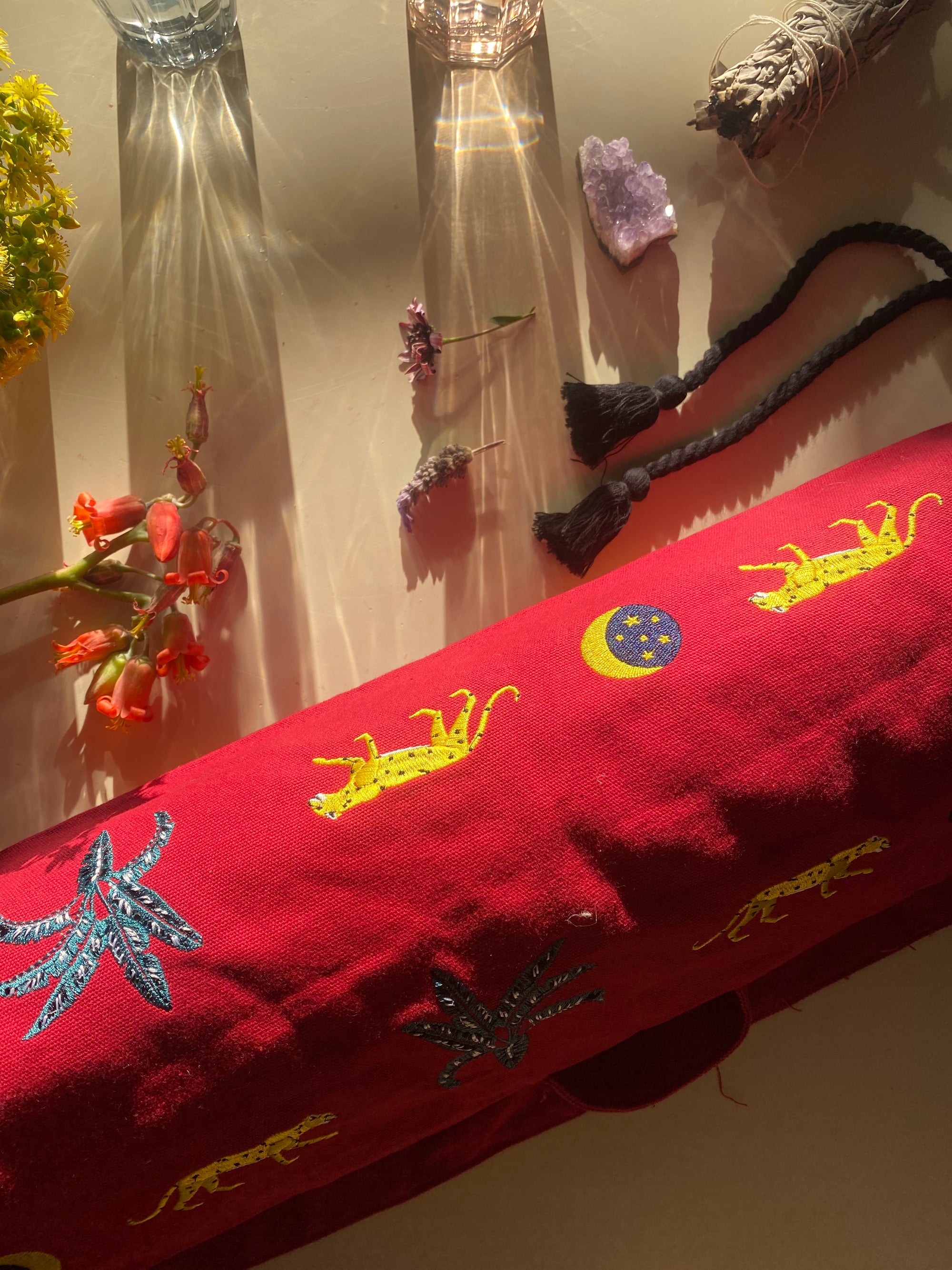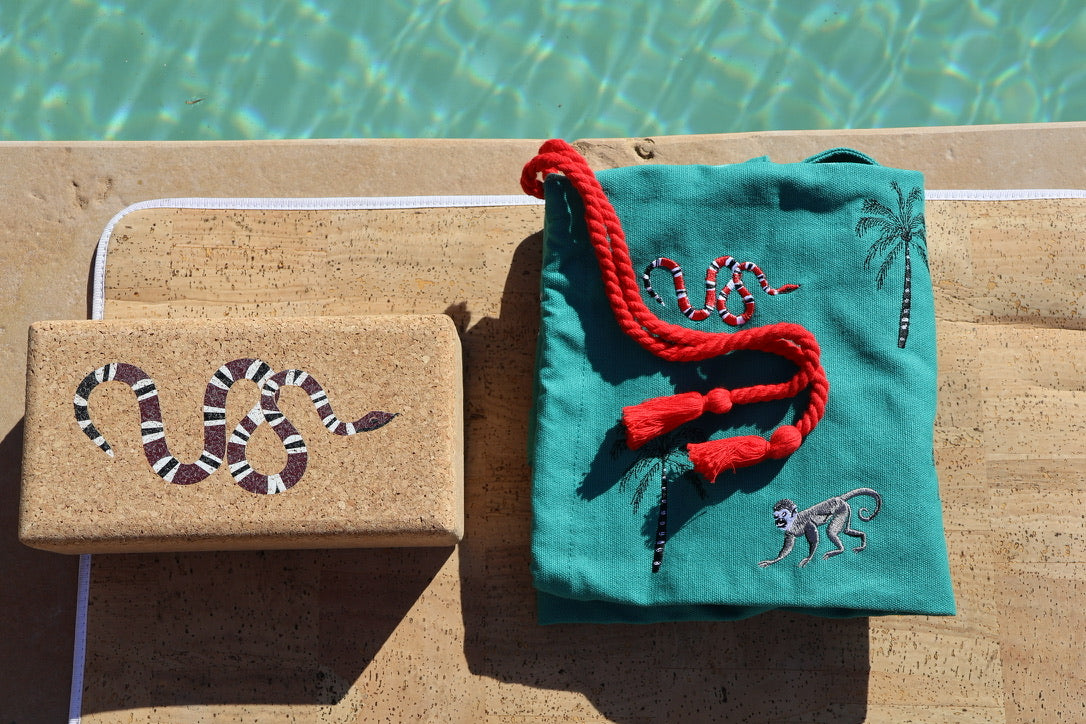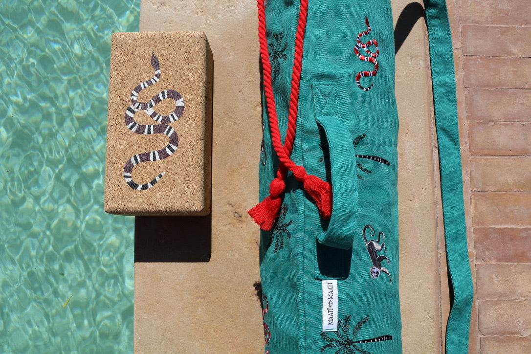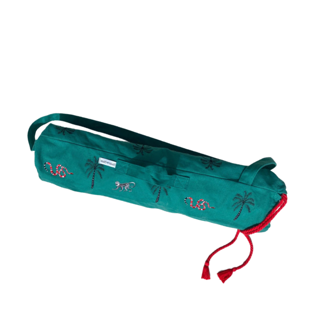 The practical yoga bag not only provides protection for your mat, but is also a stylish it-piece. It is made of canvas, a strong, tightly woven yarn and has a macramé cord. The high-quality design is embroidered with different icons, which symbolize the specific partner charity projects per collection.